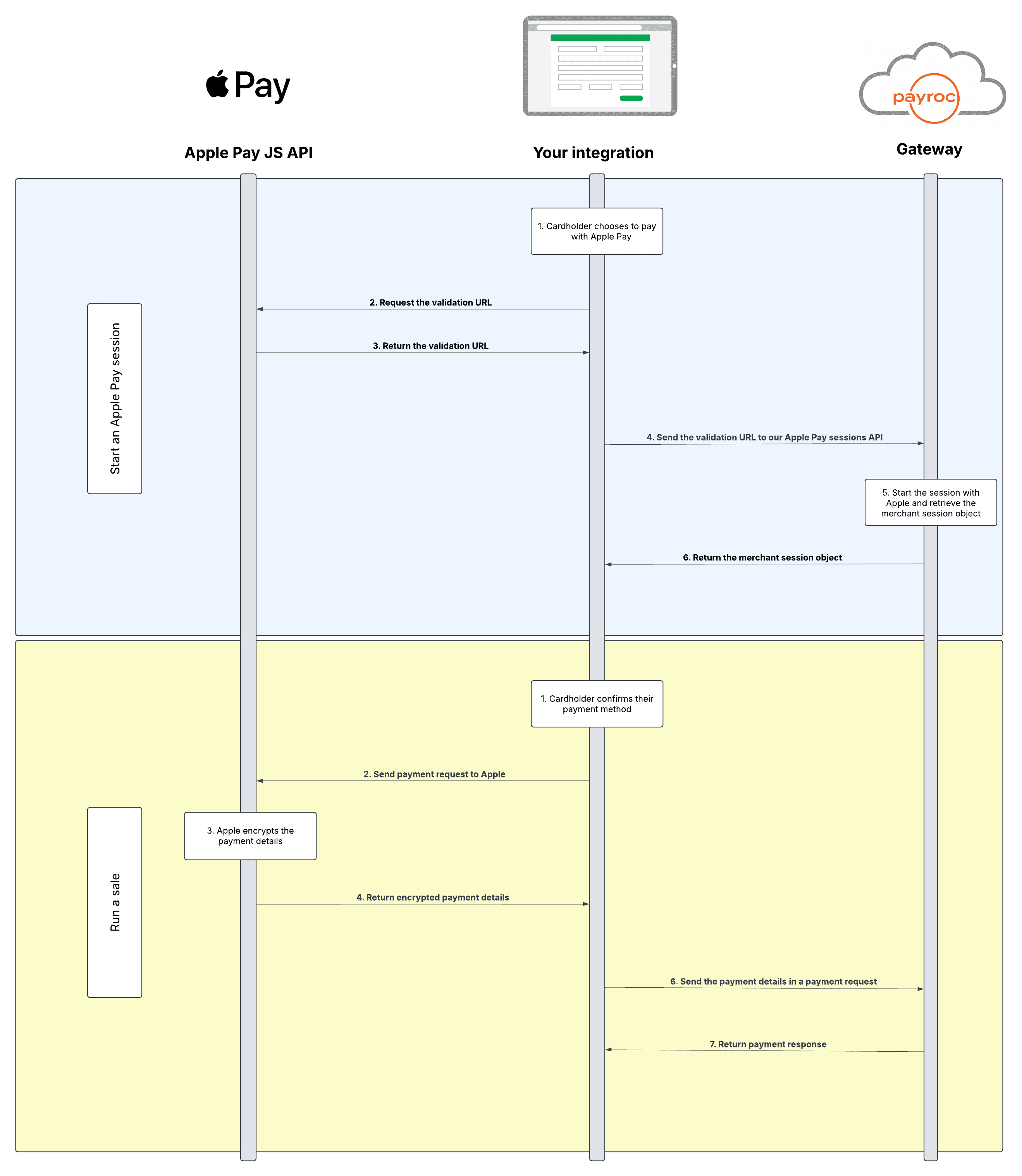 Apple Pay® is a digital wallet application that Apple customers can use to store payment card details and to pay for goods and services using their Apple devices.When you add Apple Pay to your integration, your merchants can accept Apple Pay as a payment method for online transactions. When a customer uses Apple Pay to make a payment, your integration communicates with the Apple JS API and the Payroc gateway to make the sale.