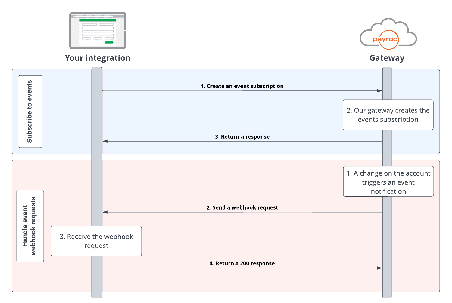 Event subscriptions are a feature of our API that you can subscribe to so that we notify you about changes to an account, for example, when we change the status of a processing account.